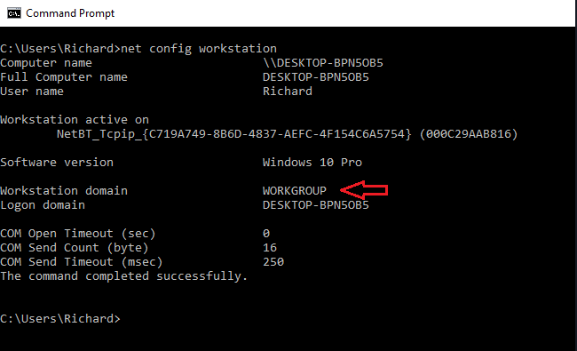 When you run the commands above, you should see your current Workstation domain name for the computer… Mostly, it would be called WORKGROUP